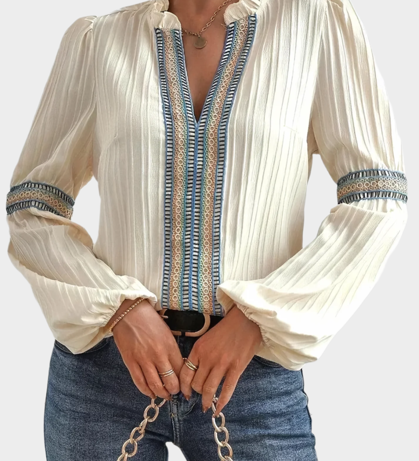 Lanena bluzo s potisnim vzorcem in V-izrezom