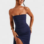 Gala maksi obleka z dramatičnim razporkom je vaša nova izbira za eleganco in stil. Ta breznaramnična obleka je zasnovana za poudarjanje vaše postave in podaljšanje silhuete.