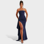 Visok stranski razporek z asimetričnim panelom doda učinek rdeče preproge, medtem ko raztegljiva tkanina nudi udobje od prvega zdravja do zadnjega plesa. Idealna za poroke, gala dogodke in vse večere, ko želite izgledati brezhibno.