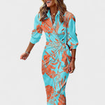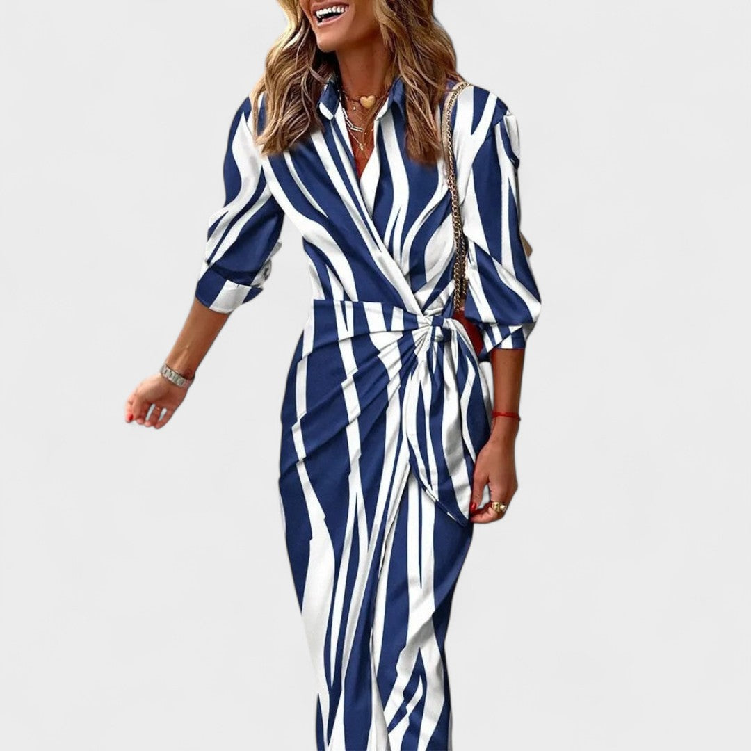 Živahna dolga obleka, ki očara v gibanju! Obleka s srajčnim krojem, elegantnim ovratnikom in gumbi, iz lahke in prožne tkanine, ki lepo pada. Njena fluidna silhueta s prefinjenim razporkom ustvari takojšen učinek.