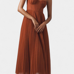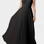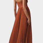 Obleka Nives združuje mehkobo plisirane šifonske tkanine in trdnost klasičnega korzeta , kar ustvarja čarobno ravnotežje z eleganco in definicijo . Njen srcoliki izrez nežno okvirja oprsja, medtem ko midi krilo v obliki zvona vsakemu sledi koraku s fluidnostjo.