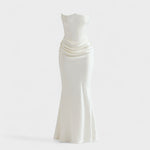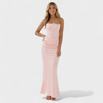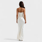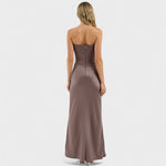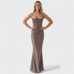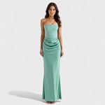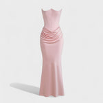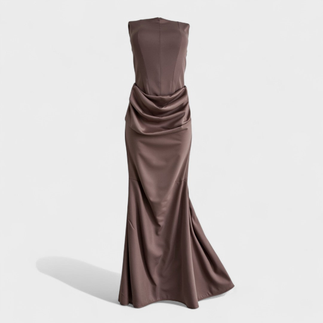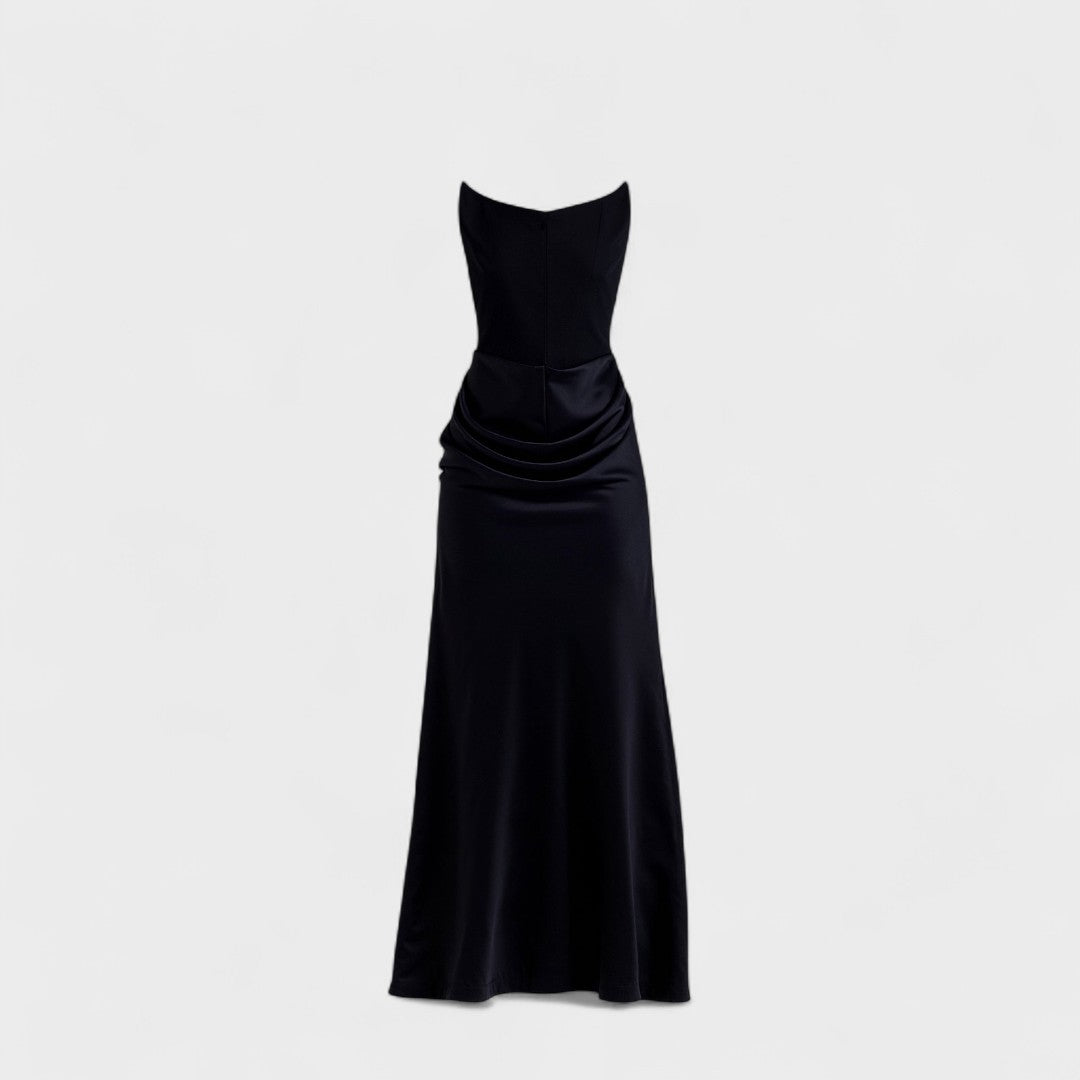 Obleka 'Radmila' predstavlja začasno eleganco v svoji najlepši različici. Ta dolga obleka s stilom bustier brez naramnic je izdelana iz mat materiala, ki nudi popolno osnovo, medtem ko umetniški naborek na bokih ustvarja vidne oblike.