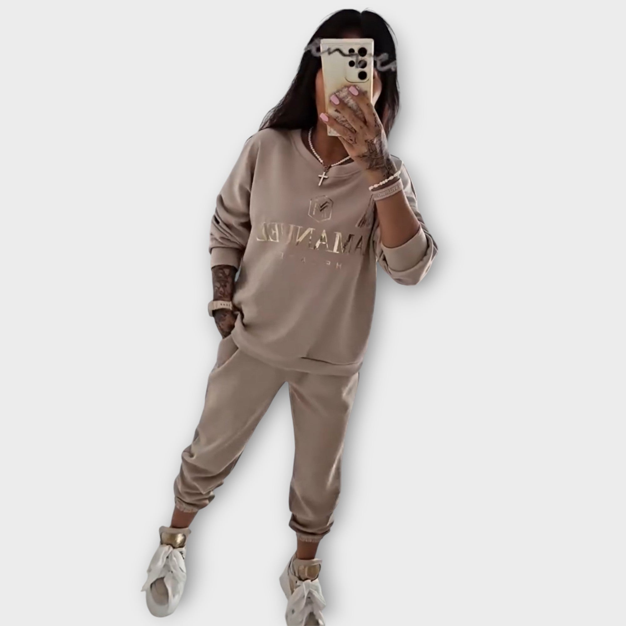 Komplet trenirke z minimalističnim dizajnom in udobjem.