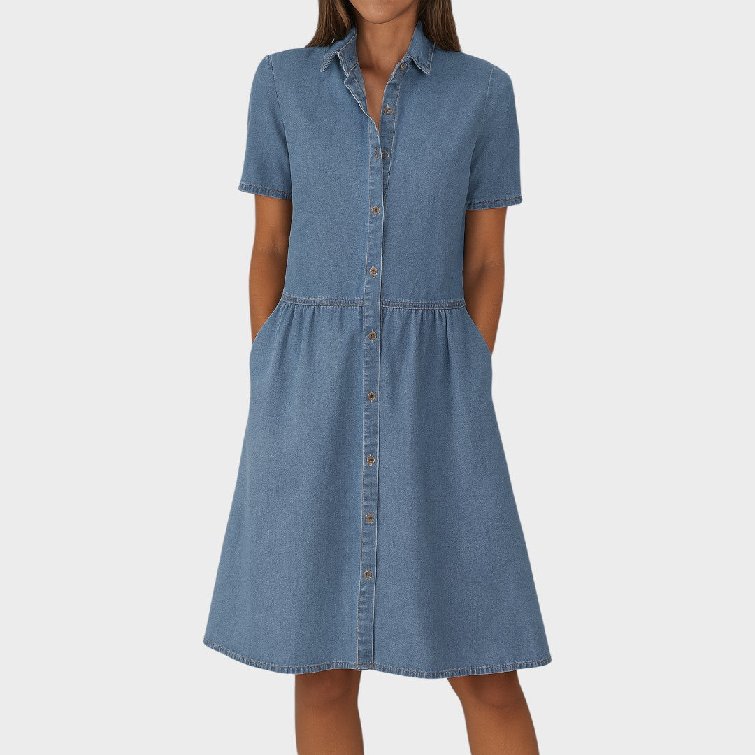Ta srajčna obleka prinaša popolno kombinacijo praktičnosti in brezčasnega sloga. Klasičen kroj z gumbi po celotni dolžnosti in ovratniku nudi urejen in moderen videz , medtem ko ohlapno padanje materiala zagotavlja udobje skozi ves dan . Stranski žepi dodajajo funkcionalnost in sproščen prideh, kar jo dela idealno za vsakodnevne kombinacije.