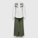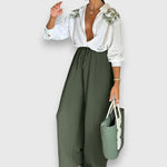 Nivana komplet združuje eleganco in udobje v enem. Sestavljen iz bluze s subtilnim cvetličnim vzorcem in širokih hlačah je odlična izbira za stilne dni.