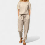 Osvežite svojo poletno garderobo s tem elegantnim in udobnim dvoslojnim kompletom , idealnim za vroče dni in sveže večere. Sestavljen iz lahkotne bluze in širokih hlač z vrvico , ponuja udobje in stil za vsako priložnost.