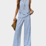 Poletni komplet z brezrokavnikom in širokimi vzorčastimi hlačami