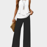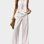 Vdihnite svežino in stil! Ta čudovit ženski komplet združuje eleganten brezrokavnik s širokimi hlačami z listnatim vzorcem , kar naredi popolnega za tople dni, priložnostne izlete ali počitnice.