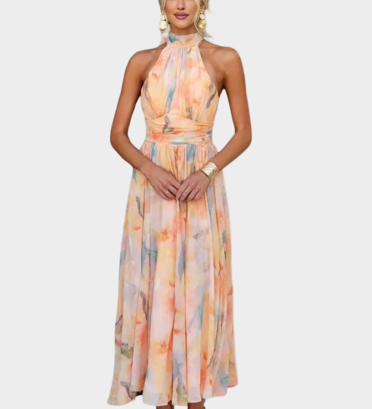 Dolga obleka v rumeni barvi z odprtimi hrbti