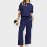 Komplet loungeweara, ki združuje stil in udobje, ter ponuja idealno ravnotežje med eleganco in praktičnostjo. Njegov vsestranski dizajn ga dela idealnim za vse priložnosti, od vsakdanjega življenja do sproščenih izhodov. Kus, ki izžareva minimalistično estetiko in nenadobojno eleganco.