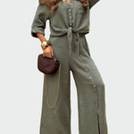 Ženski **celotni kombinezon** v kaki barvi z elegantnim in udobnim dizajnom, ki izžareva nenapornost. Ima **gumbi na zgornjem delu**, pas za vezanje v pasu za žensko silhueto in **široke hlače z gumbi na boku**, ki zagotavljajo gibljivost in stil. Idealno za vsakodnevne priložnosti, pa tudi za večerne izhode z ustreznimi dodatki.
