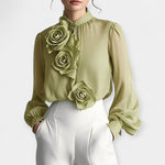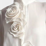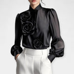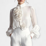 Ta bela bluzo z impresivnimi 3D aplikacijami v obliki rožic ponese vaš stil na višjo raven z rožnatim in luksuznim pridihom. Visoki ovratnik in rahlo prozorna tkanina ustvarijo lahkotno, rafinirano silhueto, idealno za kombiniranje s krojenimi hlačami ali krili.
