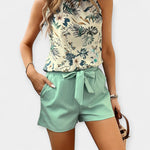 Osvežite svoj garderobni prostor s tem svetlim in svežim kompletom, idealnim za vroče dni pomladi in poletja. Halter top ponuja modernejši kroj, ki poudari ramena, medtem ko pripadajoče kratke hlače z pasom zagotavljajo stil in udobje pri vsakodnevnih aktivnostih.