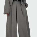 Komplet, ki združuje blazer in jakno v elegantnem in modernem kroju. Njegov dizajn poudari silhueto z diskretno eleganco, medtem ko jakna zagotavlja udobje in praktičnost. Idealno za posebej pomembne priložnosti in nastope, ki zahtevajo stil in samozavest.