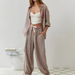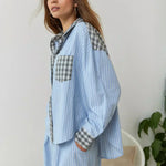 Odkrijte naš čudovit set pižam! Ta pižama združuje eleganco in udobje , ki vas bo navdušila. Sivi karirani poudarki na ovratniku, žepih in manšetah ustvarjajo rafiniran kontrast z nežno modro barvo, kar ji daje moderen videz .